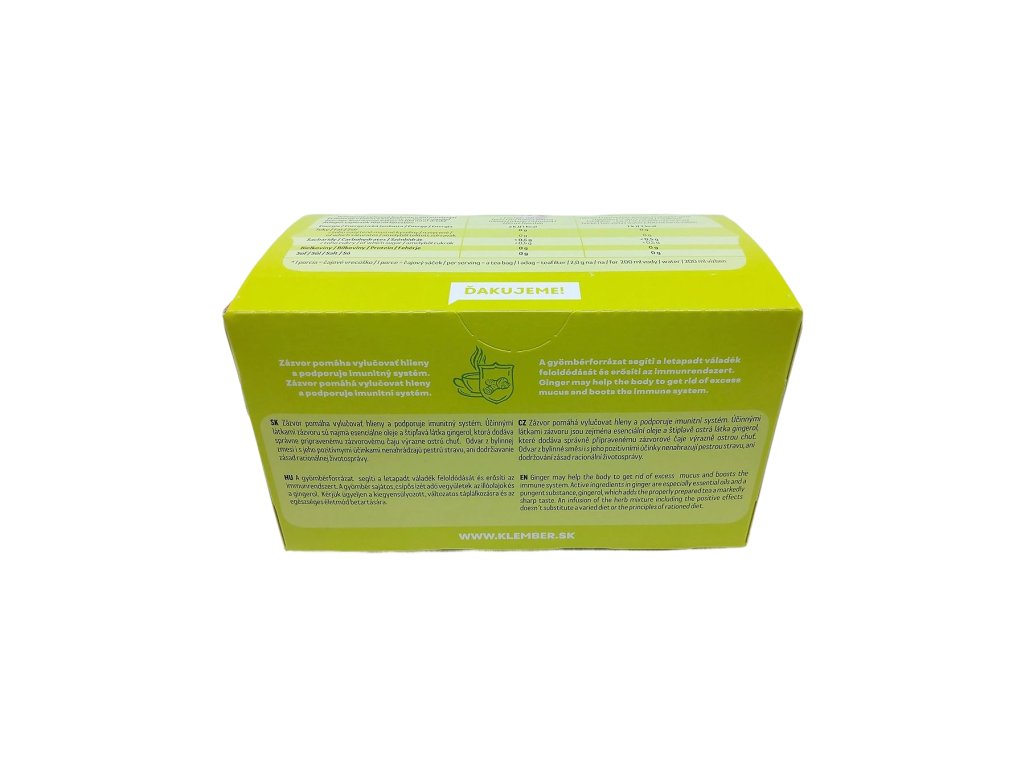 Zloženie: zázvor 53%, citrónová kôra, rooibos čaj, regulátor kyslosti-kyselina citrónová, medovka lekárska, list černice, kvet bazy čiernej, limetková a citrónová aróma.