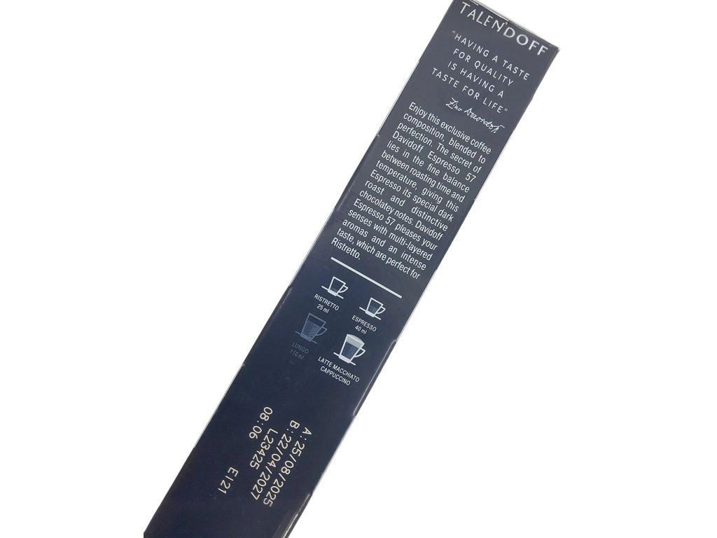 Davidoss Espresso 57 kávové kapsule je káva stvorená pre moderných objaviteľov – pre ľudí, ktorí si v rýchlom tempe života vedia nájsť chvíľu na vychutnanie kvalitnej kávy a oceniť jej jednoduchosť, čistotu a charakter.