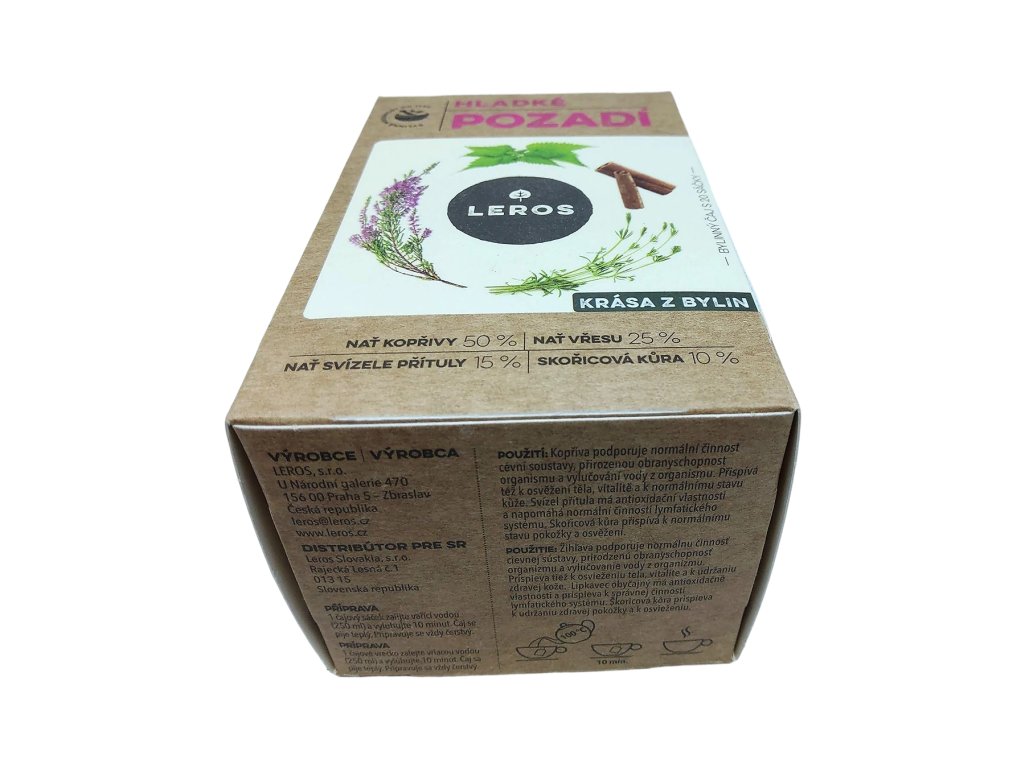 Pravidelná konzumácia tohto čaju v kombinácii s vyváženou stravou a cvičením vám môže pomôcť dosiahnuť vysnívané zamatovo hladké pozadie, pričom každá šálka pôsobí nielen na telo, ale aj na zmysly – jemná vôňa byliniek a jemne nasládlá chuť robí z pitia čaju príjemný rituál pokoja a regenerácie. Leros Hladké pozadie je viac než len čaj – je to jemná, prírodná starostlivosť, ktorá pomáha udržiavať rovnováhu tela i mysle a dodáva pocit sviežosti a krásy, ktorú môžete cítiť aj vidieť.