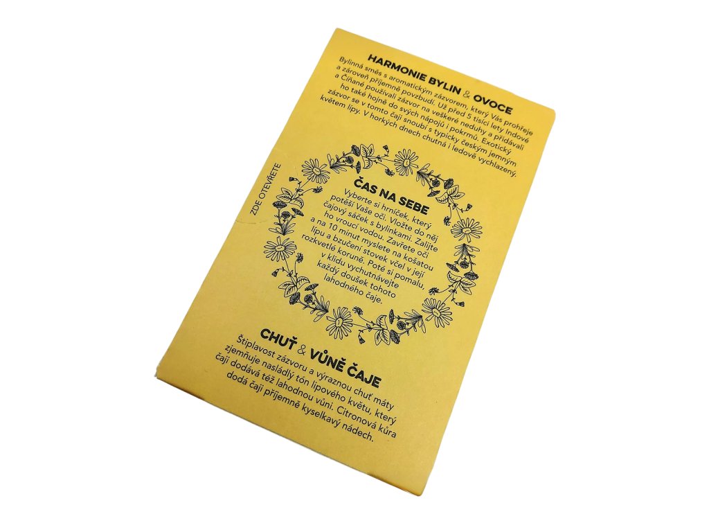 Zmes dopĺňa mäta pieporná, ktorá osviežuje chuť, čistí myšlienky a prináša chladivý závan rovnováhy. A napokon – prekvapivý, no výborne zapadajúci komponent – rooibos, ktorý so svojou jemnou, sladkastou chuťou a vysokým obsahom antioxidantov čaj krásne zjemňuje a vyvažuje.