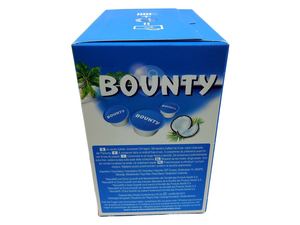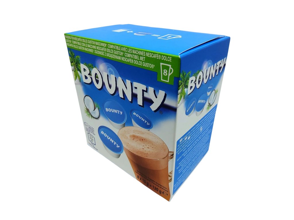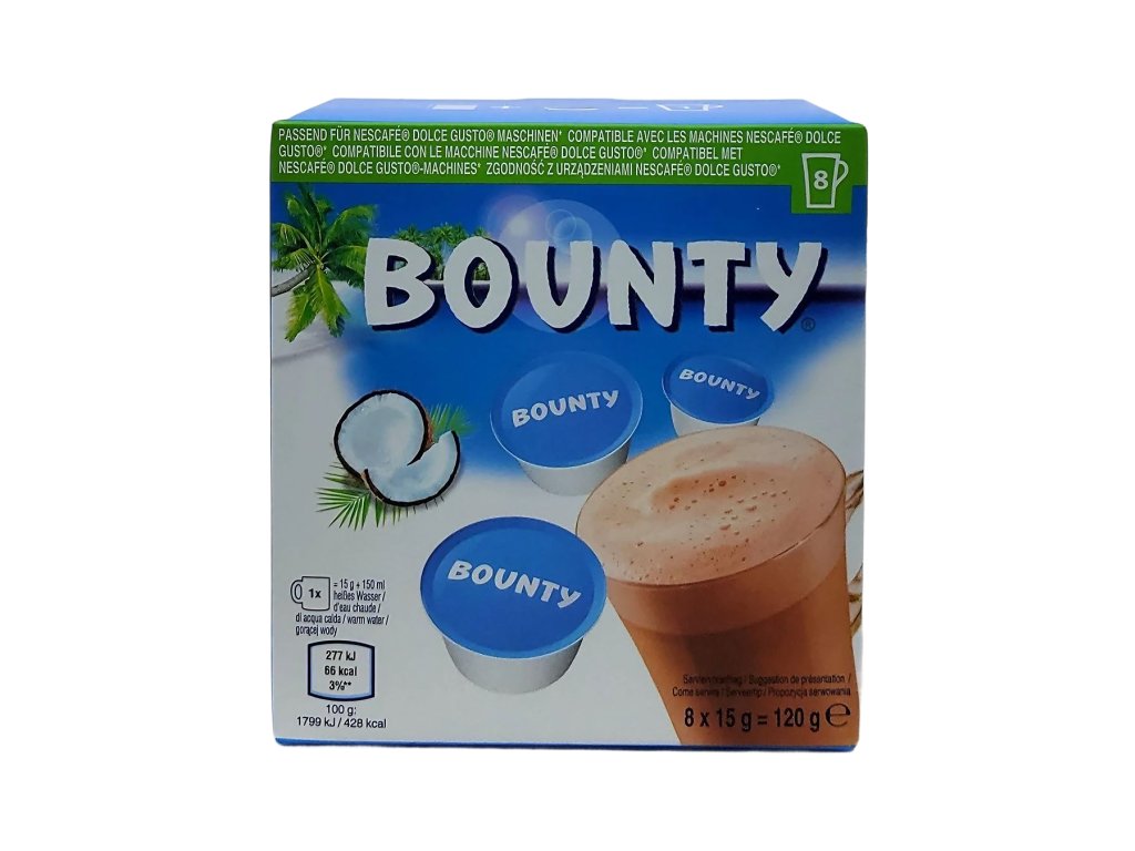 NESCAFÉ Dolce Gusto Bounty je ideálny nápoj pre milovníkov sladkých špecialít, pre chvíle relaxu po náročnom dni aj ako príjemná zmena ku káve či kakau. Doprajte si krémový čokoládovo-kokosový zážitok, ktorý vás aspoň na okamih prenesie do dovolenkovej nálady – pohodlne, rýchlo a priamo u vás doma