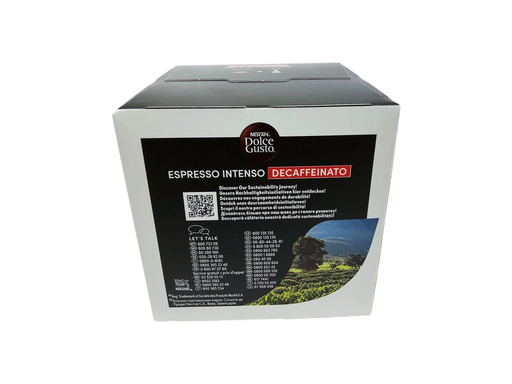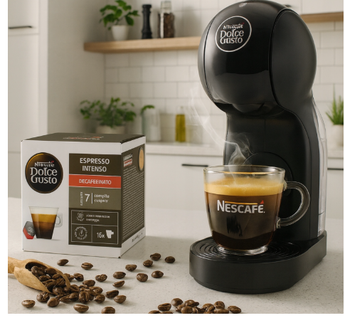 Espresso Intenso Decaffeinato je ideálnou voľbou pre večerné chvíle, pokojné popoludnia alebo pre každého, kto si chce vychutnať skutočné espresso bez kofeínu. Vďaka kapsulám NESCAFÉ Dolce Gusto si túto vyváženú, aromatickú a elegantnú kávu pripravíte jednoducho a rýchlo – vždy s rovnakým výsledkom, na ktorý sa môžete spoľahnúť.