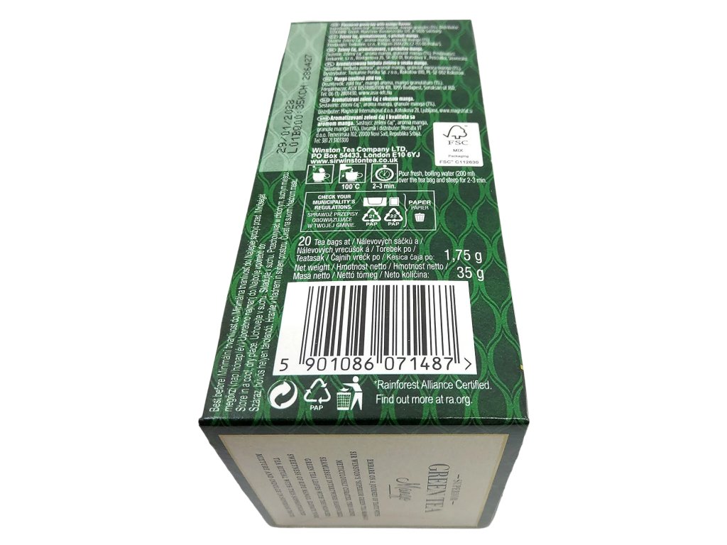 Čaj Sir Winston Tea Green Tea Mango je ako malý únik do exotického raja ukrytý v šálke. Jemný zelený čaj so svojou charakteristickou bylinnou chuťou a ľahkou trieslovinovou dochuťou tvorí elegantný základ, ktorý sa skvele dopĺňa s podmanivou sladko-ovocnou vôňou šťavnatého manga.