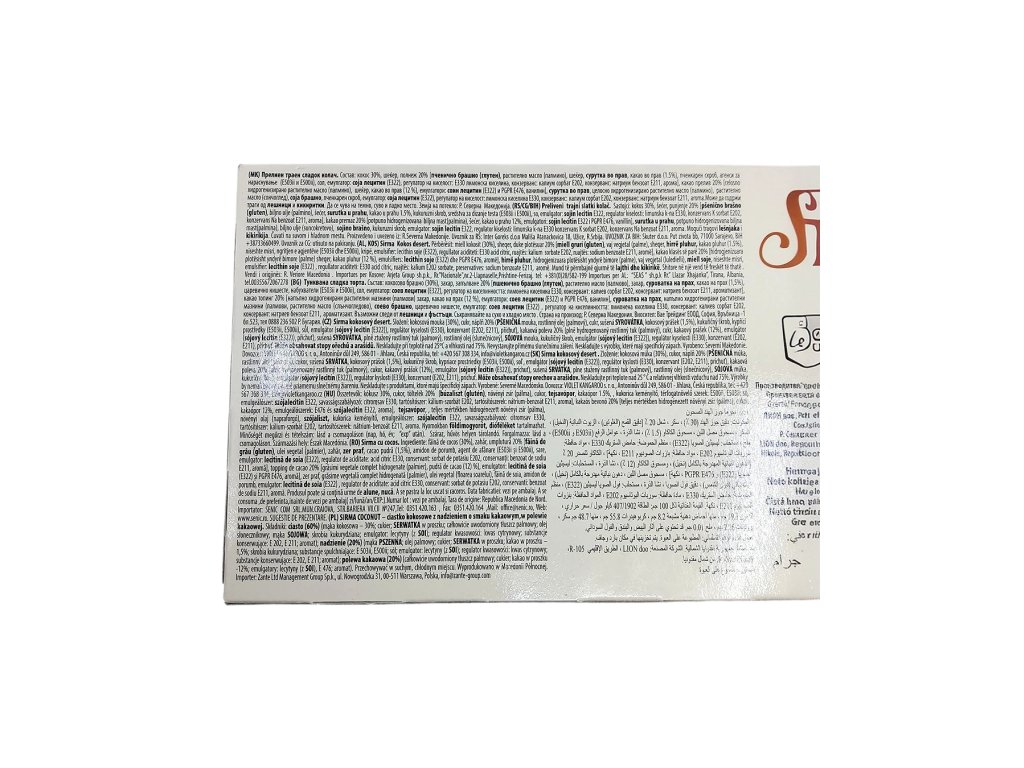 Zloženie: kokosová múka (30%), cukor, náplň -pšeničná múka, rastlinný olej (palmový), cukor, sušená srvátka, kokosový prášok (1,5%), kukuričný škrob, emulgátor (E322), kypriaci prostriedok (E503ii, E503ii, (E330), konzervant (E202, E211), príchuť kakaová poleva 20% - plne hydrogenovaný rastlinný tuk (palmový), cukor, kakaový prášok (12%), kukuričný škrob, emulgátor (E322, E476), sušený surový (slnečnicový), sójová múka, kukuričný škrob, emulgátor (E322), regulátor kyslosti (E330), konzervant (E202, E211), príchuť.