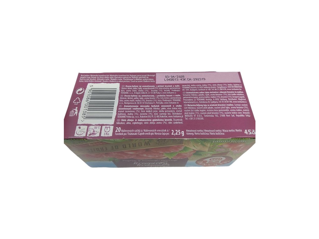 Zloženie: ibištek, jablká, šípky, listy ostružiny, aróma brusníc (7%), pomarančová kôra, aróma malín, maliny (1%), brusnice (1%), baza.